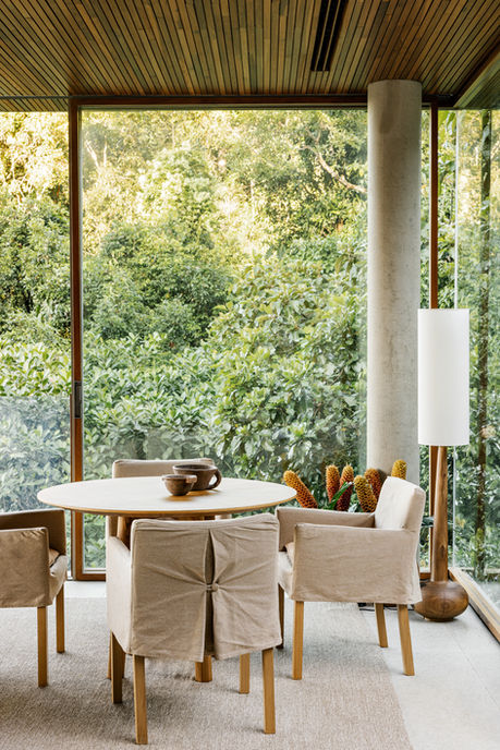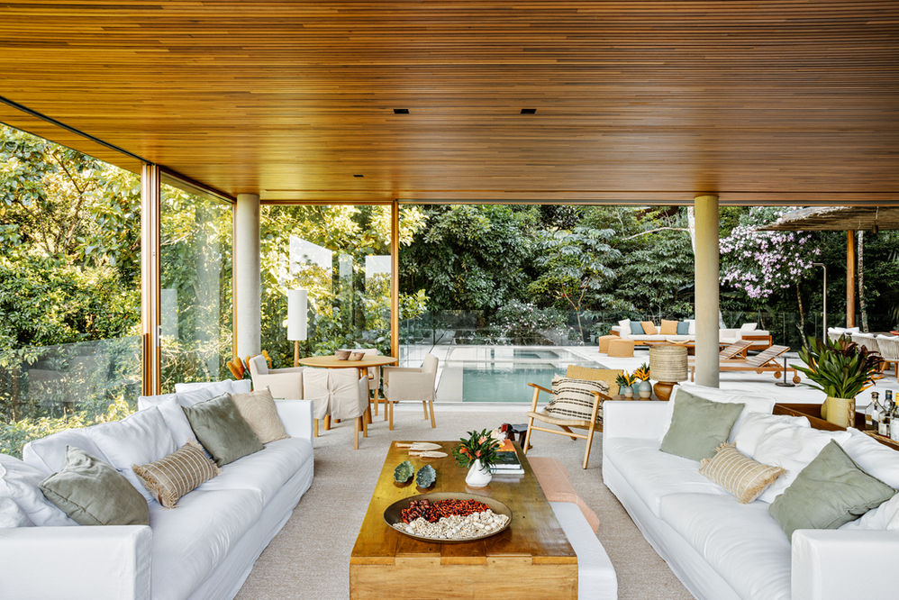 Localizada em um terreno de declive acentuado, a casa VJC Iporanga é implantada de forma a ficar totalmente integrada à vegetação nativa. O projeto de decoração da casa foi então desenvolvido a partir do conceito de respeitar a arquitetura existente e valorizar, através das texturas, tecidos e escolhas dos móveis, ainda mais a natureza ao seu redor, com uma composição de móveis garimpados, comprados de lojas e outros ainda, desenhados sob medida e assinados por Marina especialmente para o projeto.